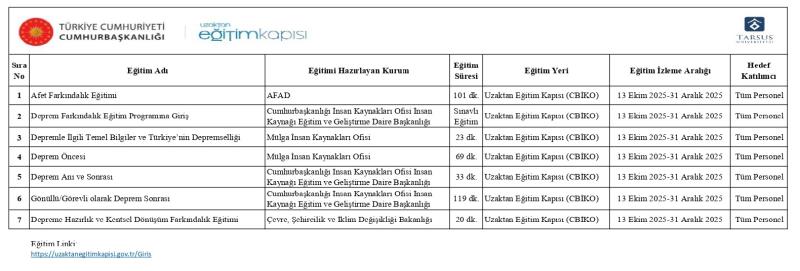 Bu doğrultuda “Tarsus Üniversitesi Rektörlüğü Personel Daire Başkanlığı 2025 Yılı Hizmet İçi Eğitim Planı”nda yer alan eğitimler, Cumhurbaşkanlığı Uzaktan Eğitim Kapısı platformu (https://uzaktanegitimkapisi.cbiko.gov.tr) üzerinden tüm personele izlenime açılmıştır.